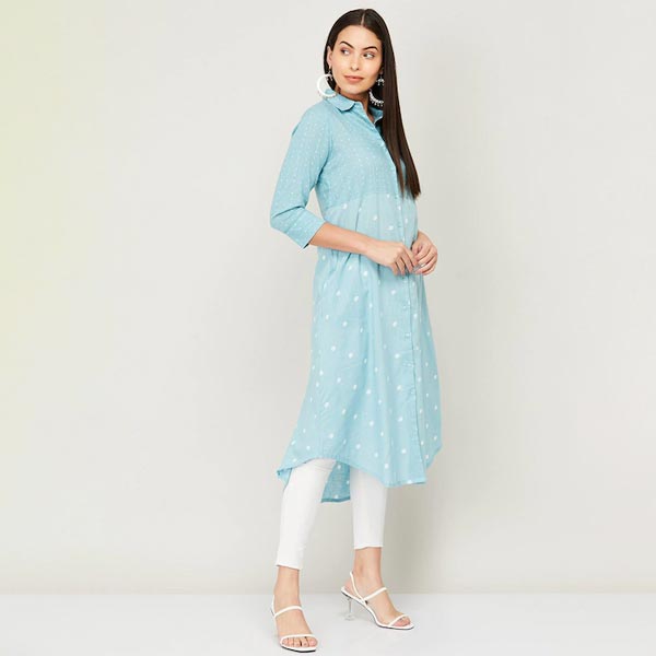 Blue & White Shirt Collar Polka Dots Printed Tunic
